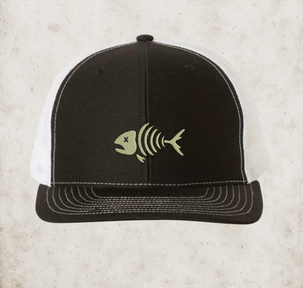 The Skelton Fish Hat puts a spooky twist on a timeless outdoors graphic. Stitched on a classic black and white cap, the skeleton fish design is fully embroidered with glow-in-the-dark thread — making it stand out whether you’re on the water or by the campfire.