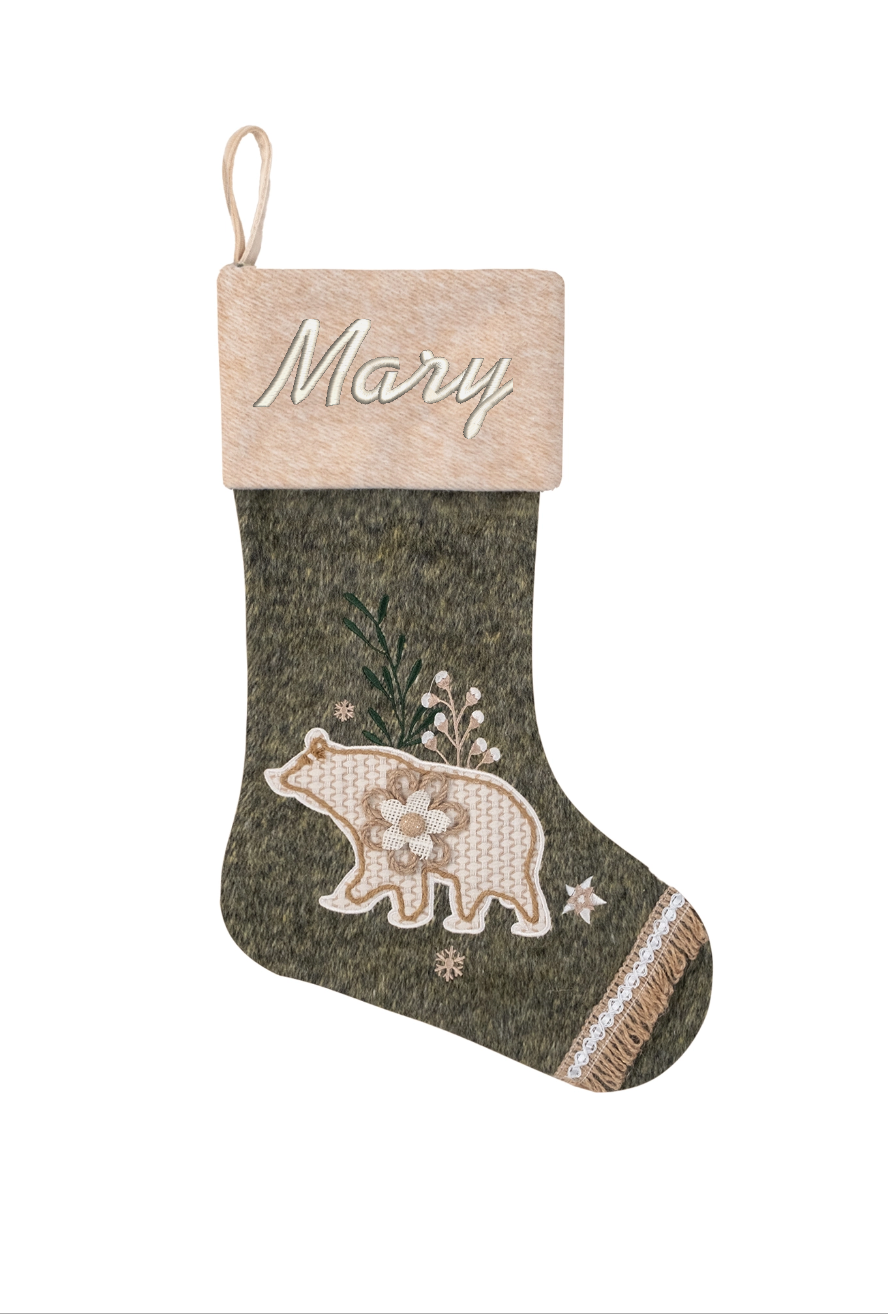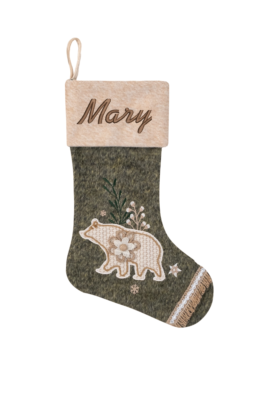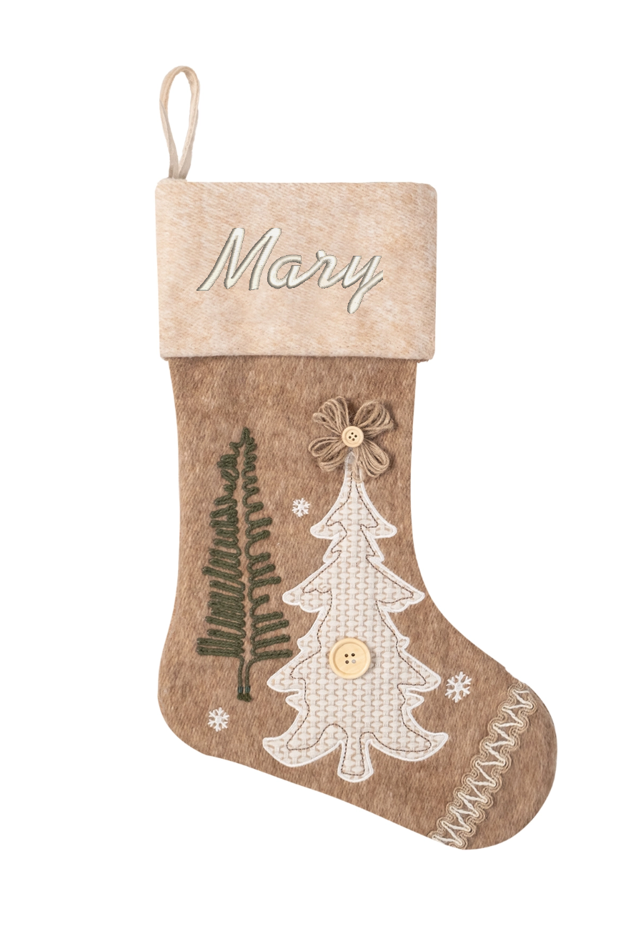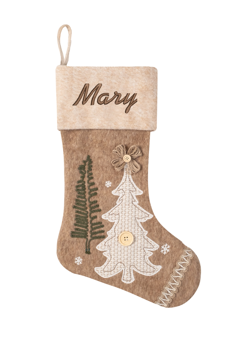 Cozy, rustic Christmas stockings personalized just for your family. Each stocking features soft felt fabric, woodland embroidery, and your custom name stitched on the cuff in off-white or brown thread. Perfect for fireplaces, gifting, and creating holiday traditions.