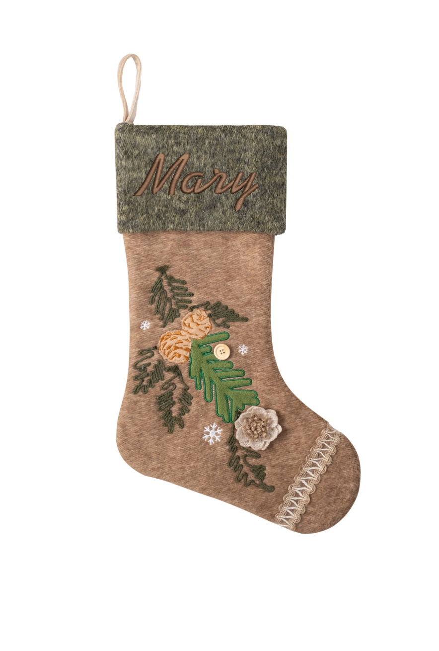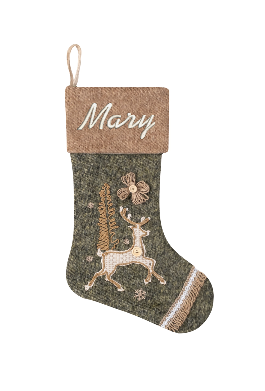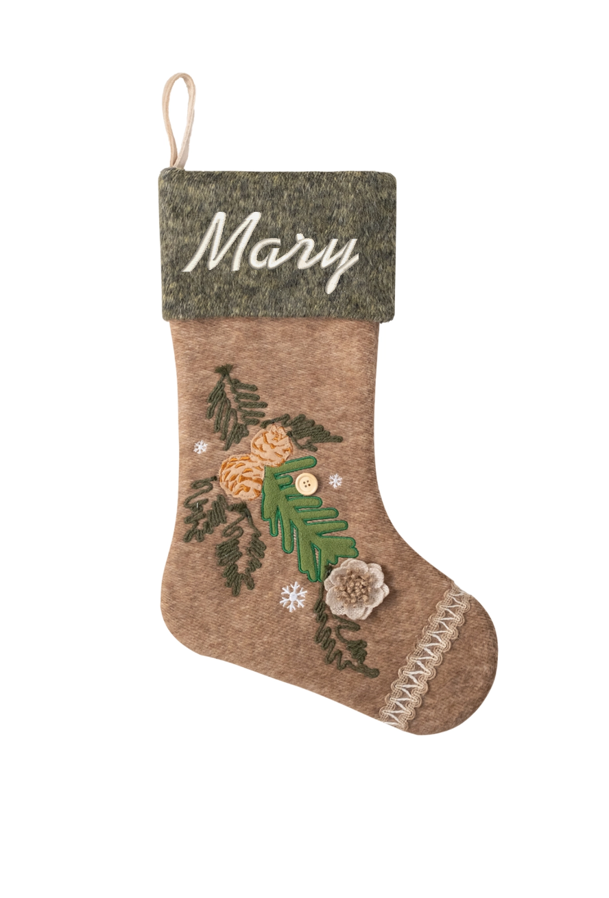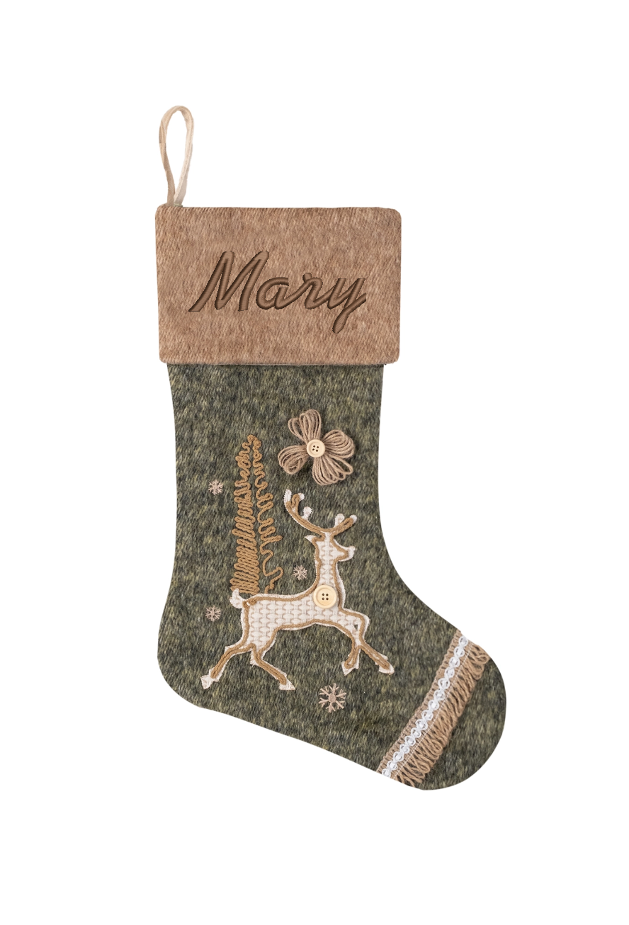 Cozy, rustic Christmas stockings personalized just for your family. Each stocking features soft felt fabric, woodland embroidery, and your custom name stitched on the cuff in off-white or brown thread. Perfect for fireplaces, gifting, and creating holiday traditions.